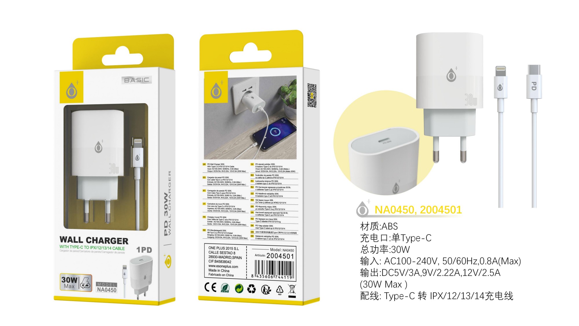 NA0450 BL Cargador de Red Rapida Jorwin 30W, 1 Type-C PD, Con cable Type-C a Iphone, Blanco