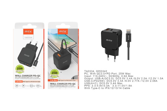 • TA0334 BL Cargador de Red Rapida Fay , 2 puertos (PD+QC 3.0), Con Cable Type-C a Lightning, 25W/3.4A(Max), Blanco