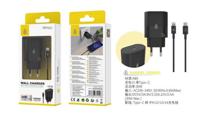 NA0450 NE Cargador de Red Rapida Jorwin 30W, 1 Type-C PD, Con cable Type-C a Iphone, Negro
