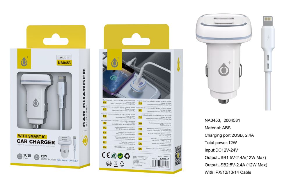 NA0453 BL Cargador de Mechero Bryan Con Smart Chip IC, 2 USB-A con cable Iphone 5-14, 2.4A/12W Max, Blanco