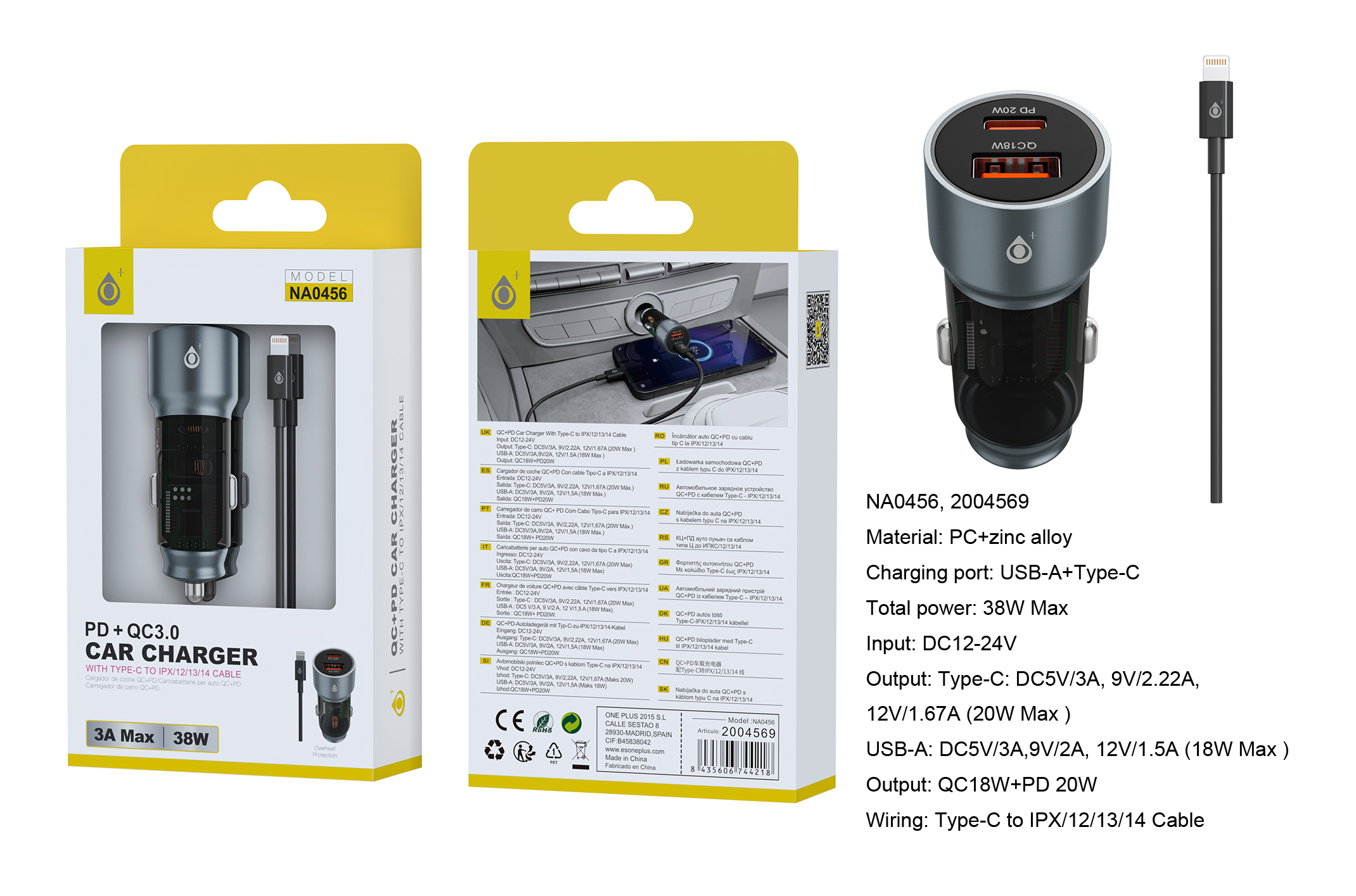 NA0456 GR Cargador de Mechero Blaz Zin alloy con carga rapido, USB-C(20W)+USB-A QC 3.0(18W) Con cable Lightning, 38W/3A Max, Gris