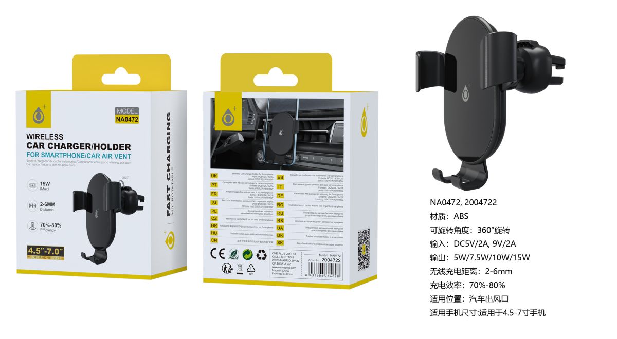 NA0472 NE Soporte Universal de Movil para Airvent de coche, Soporta Carga Inalambrica 15W,para movil 4.5-7 pulgadas, Negro