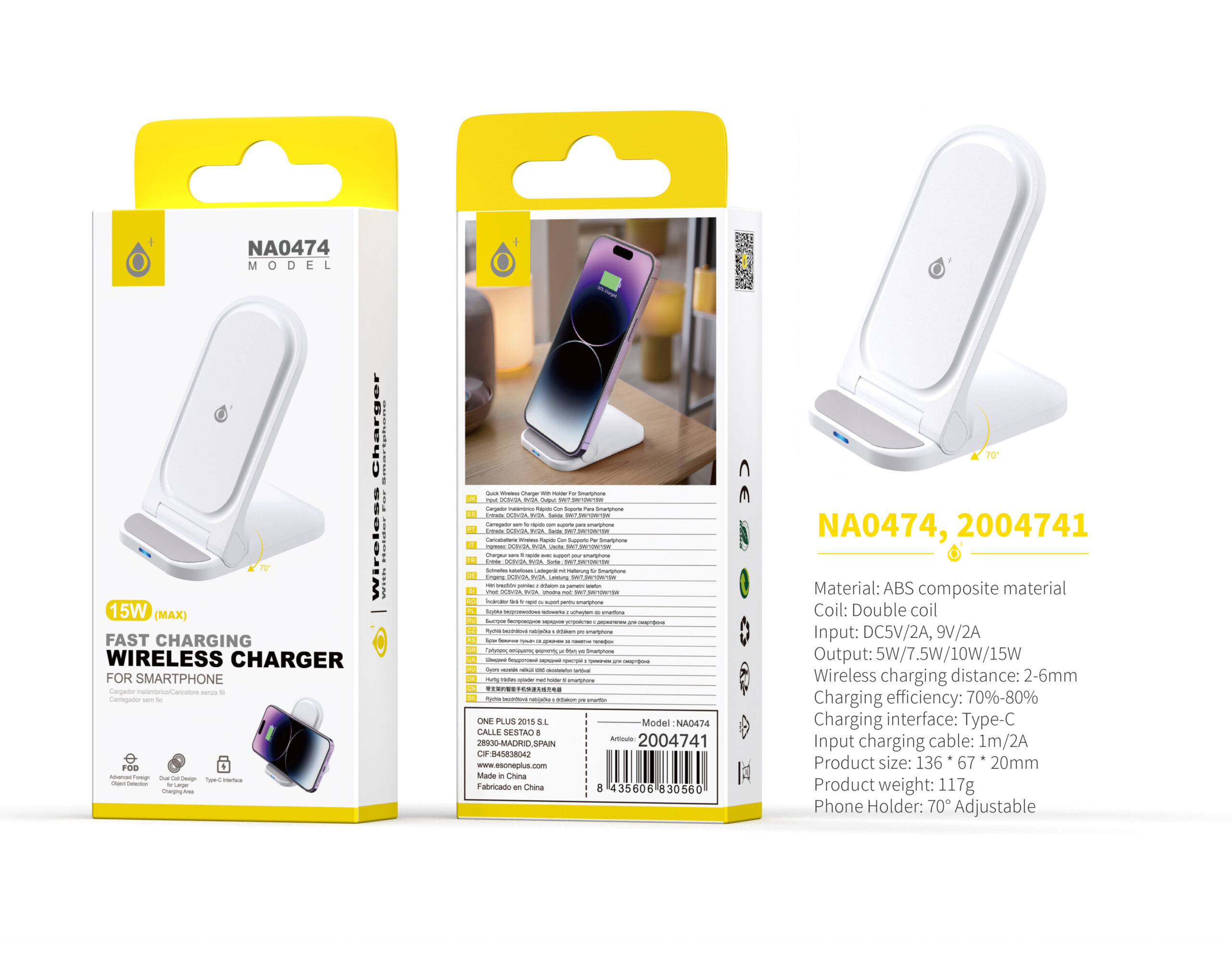 NA0474 BL Cargador inalambrico con soporte para movil, 15W,白色