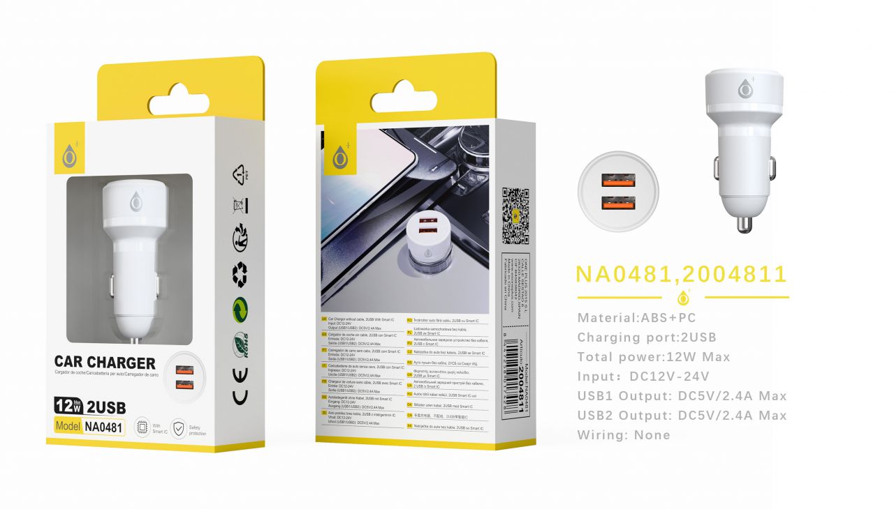 NA0481 BL Cargador de Mechero Liora 2 USB-A con IC chip, Sin cable, 12W/2.4A, Blnaco