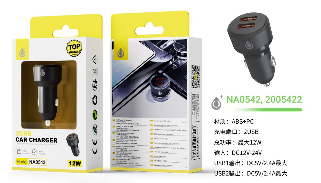 NA0542 NE Cargador de Mechero TAC 2 USB-A con IC chip, Sin cable, 12W/2.4A, Negro
