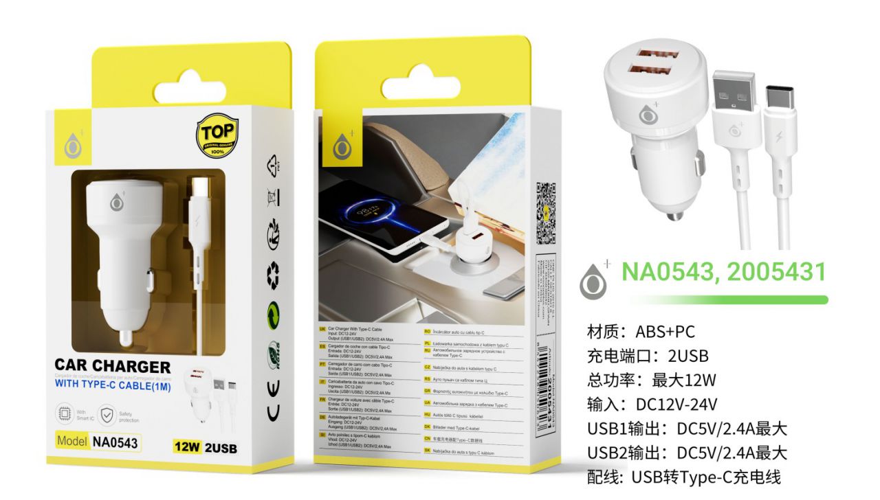 NA0543 BL Cargador de Mechero TAC 2 USB-A con IC chip, Con cable Type-C, 12W/2.4A, Blnaco