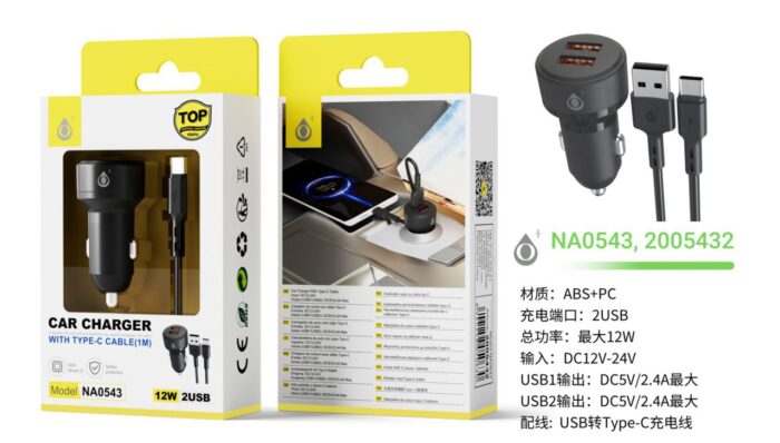 • NA0260 NE Cargador de Coche Biron con Cable Type-C, Chip de Reconocimiento Inteligente, con 2 USB, 2.4A, Negro