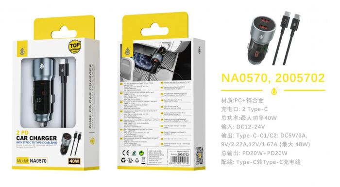 • NA0570 GR Cargador de Mechero Cas Zin alloy con carga rapido, USB-C*2(40W Max), Con cable Type-C, 40W/3A Max, Gris