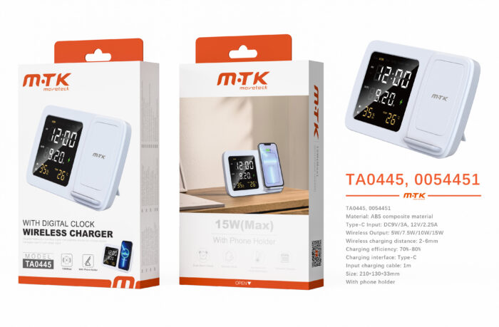 • TA0445 BL Luxury Cargador inalambrico 15W con reloj digital, Blanco