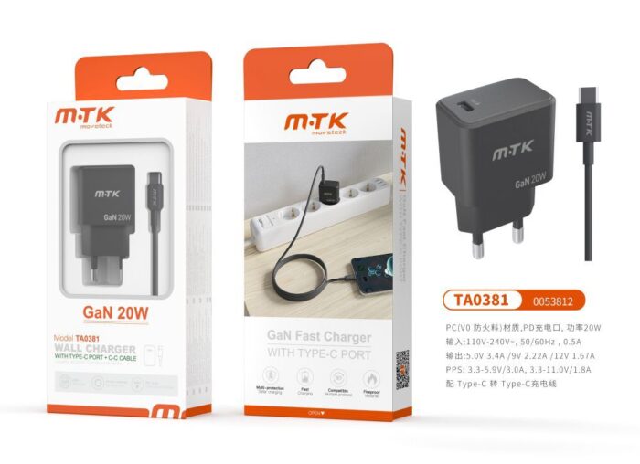 • TA0344 BL Cargador Rapido de Pared Marga Sin cable , Entrada Type-C(PD)/20W/3.4A Max , Blanco