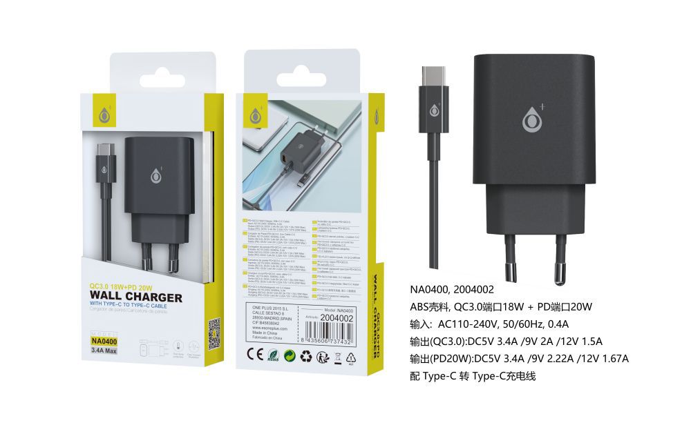 NA400 NE Cargador Rapido de Pared Berta Con cable Type-C a Type-C, Type-C(PD 20W)+QC 3.0 (18W)3.4A Max , Negro