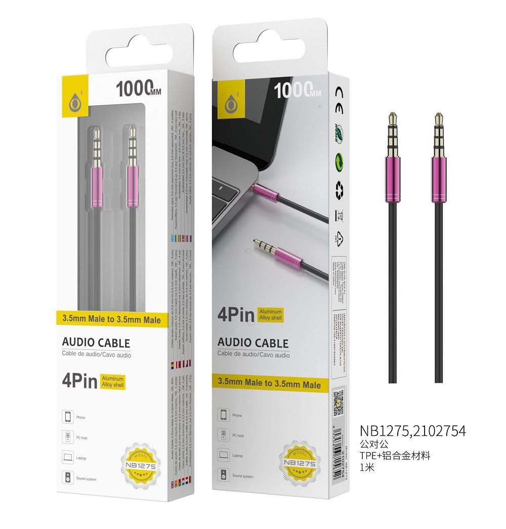 NB1275 RS Cable de Audio Fox de Aluminio de 3.5mm a 3.5mm Macho a Macho, 4Pin, Longitud 1 M, Rosa