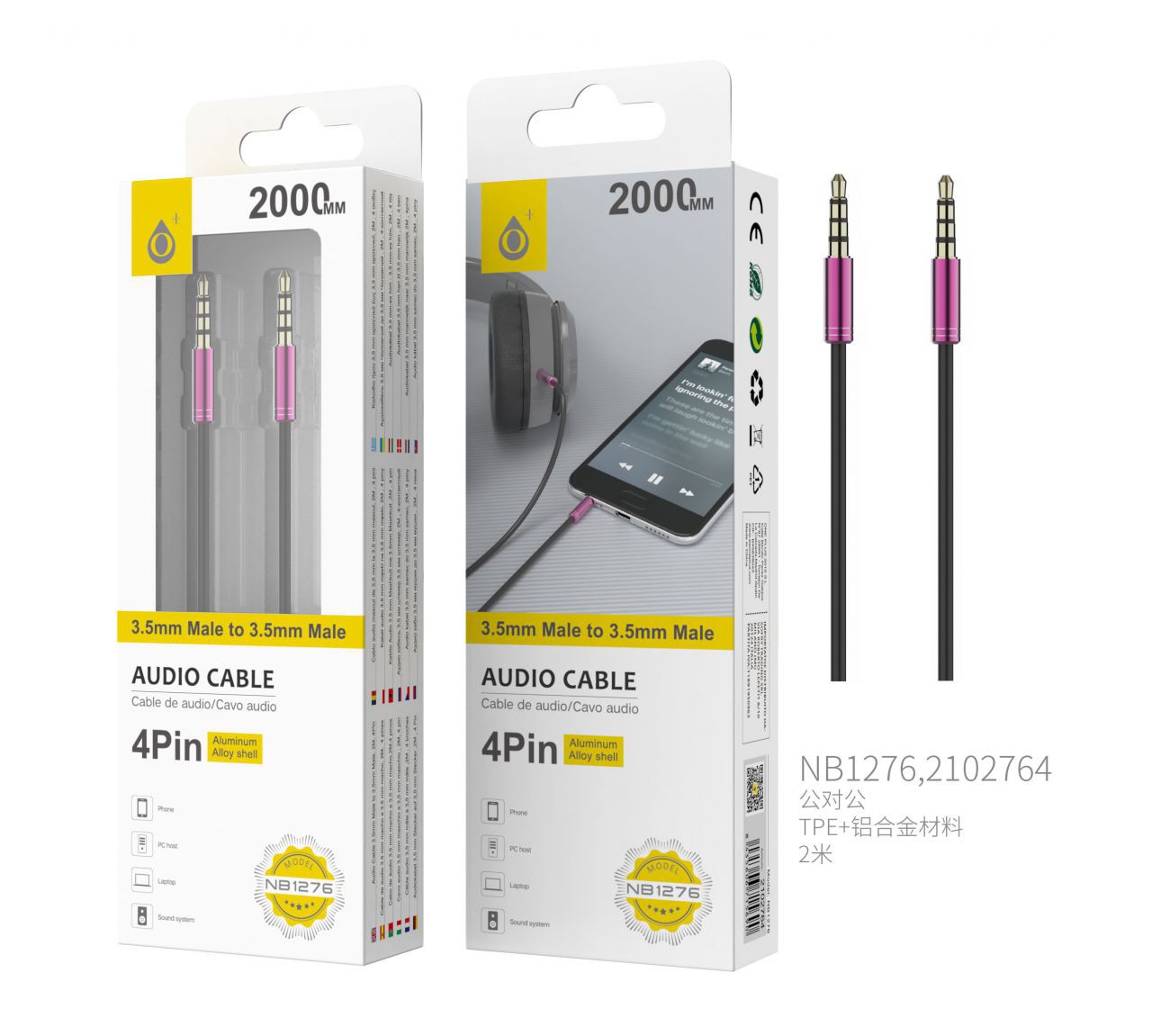 NB1276 RS Cable de Audio Fox de Aluminio de 3.5mm a 3.5mm Macho a Macho, 4Pin, Longitud 2 M, Rosa