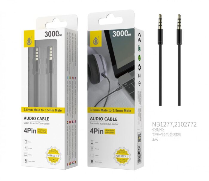 NB1277 NE Cable de Audio Fox de Aluminio de 3.5mm a 3.5mm Macho a Macho, 4Pin, Longitud 2 M, Negro