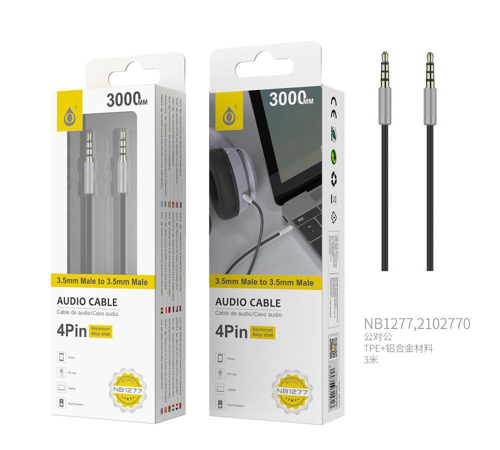 NB1277 PL Cable de Audio Fox de Aluminio de 3.5mm a 3.5mm Macho a Macho, 4Pin, Longitud 3 M, Plata