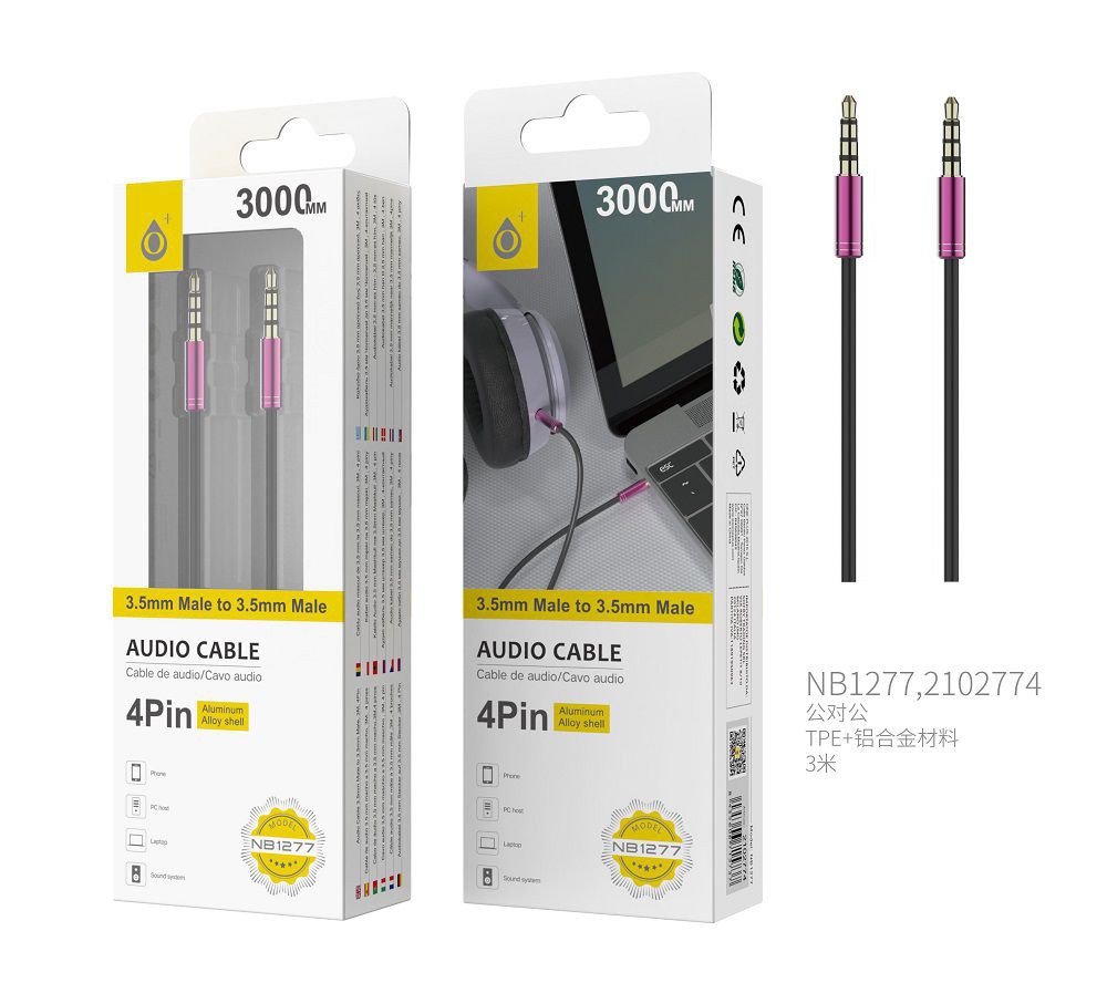NB1277 RS Cable de Audio Fox de Aluminio de 3.5mm a 3.5mm Macho a Macho, 4Pin, Longitud 3 M, Rosa