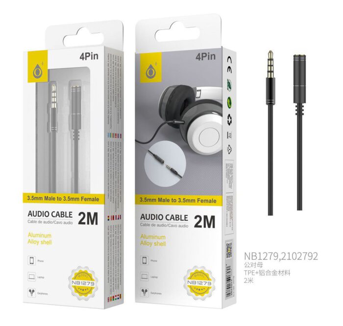 NB1279 NE Cable de Audio Fox de Aluminio de 3.5mm a 3.5mm Macho a Hembra, 4Pin, Longitud 2 M, Negro