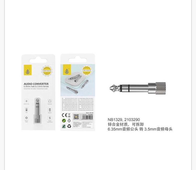 NB1329 Adaptador Audio Jack 6.35mm a  3.35mm (Macho a Hembra),Plata