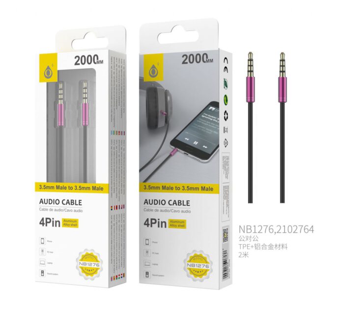 • NB1276 NE Cable de Audio Fox de Aluminio de 3.5mm a 3.5mm Macho a Macho, 4Pin, Longitud 2 M, Negro