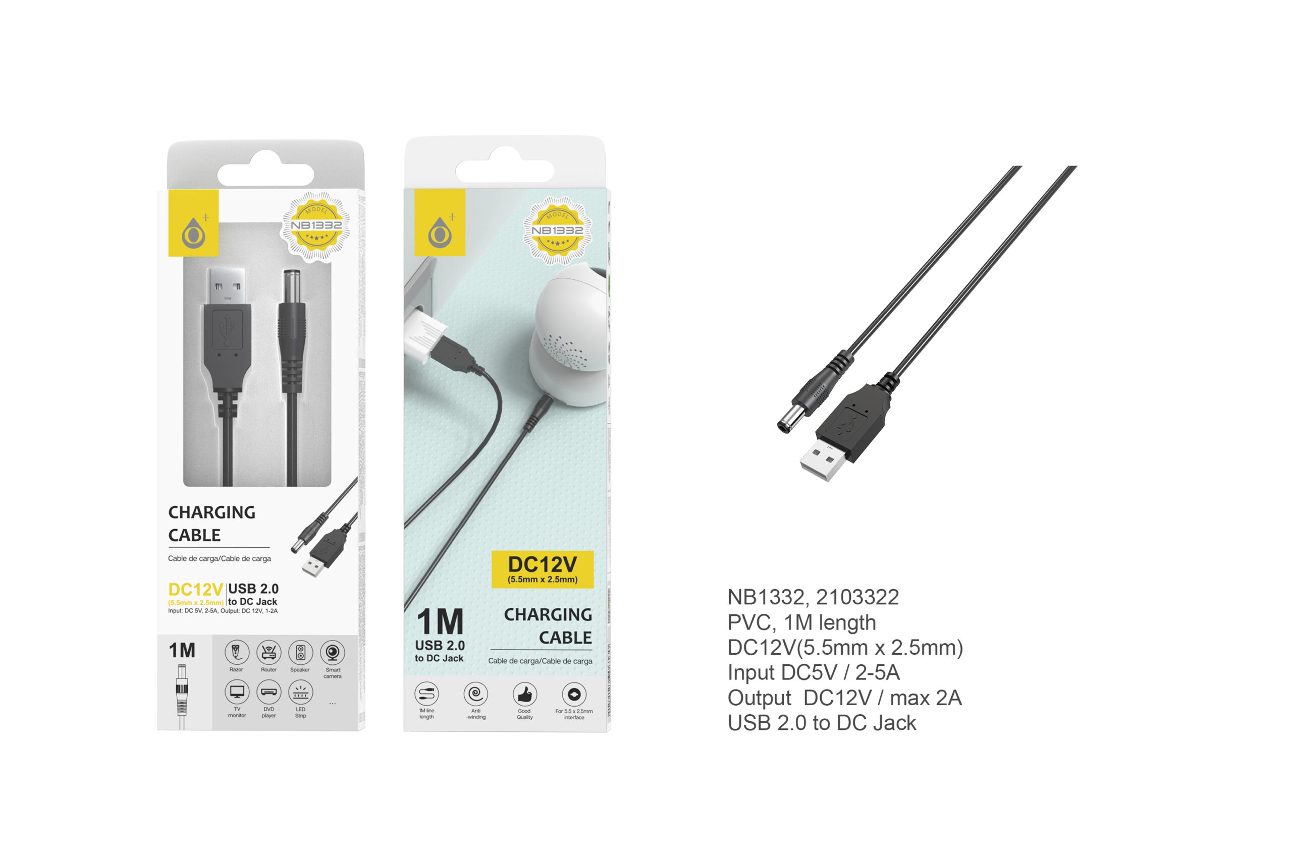NB1332 NE Cable de Carga USB con Conector Jack DC 12V ( 5.5mm X 2,5mm), Negro