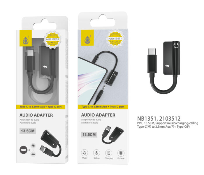 NB1351 NE Adaptador DUAL, a Audio 3.5mm y Carga Type-C, Cable 13.5cm, Negro