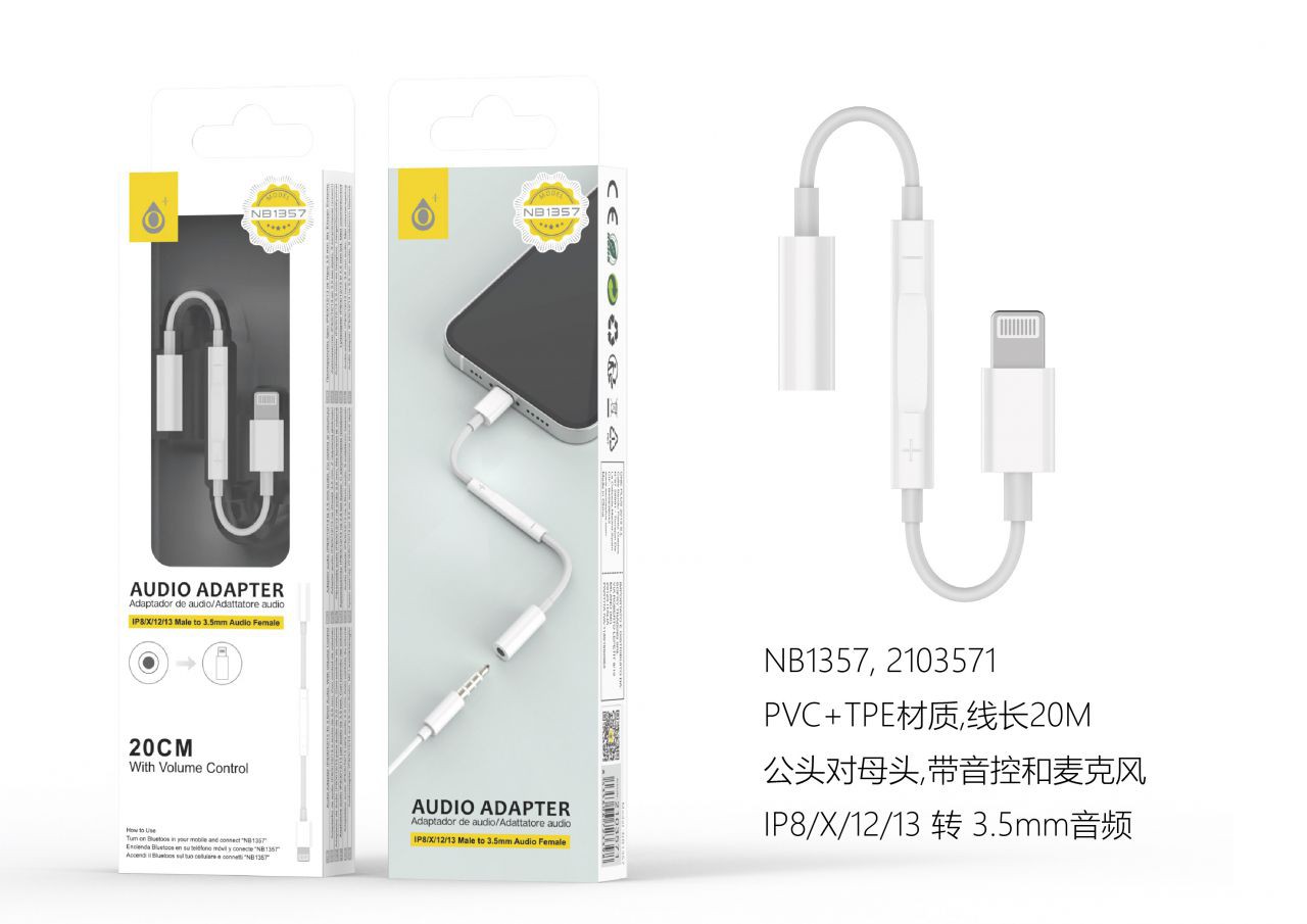NB1357 BL Cable Adaptador con Contro de Volumen, Ligthning a Jack 3.5mm 20cm (Necesario Activar Bluetooth) , Blanco
