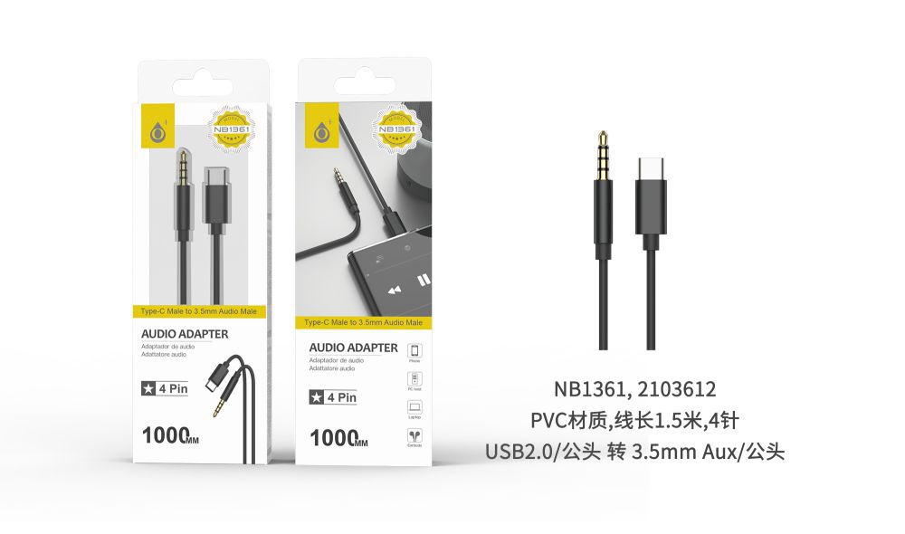 NB1361 NE Cable de Type-C a Audio Jack 3.5mm 4 Pin, Cable 1m, Negro