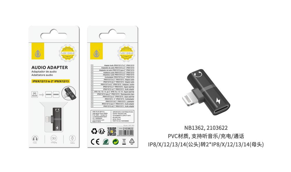 NB1362 NE Adaptador de Audio y Carga de Iphone 5-14 , Negro