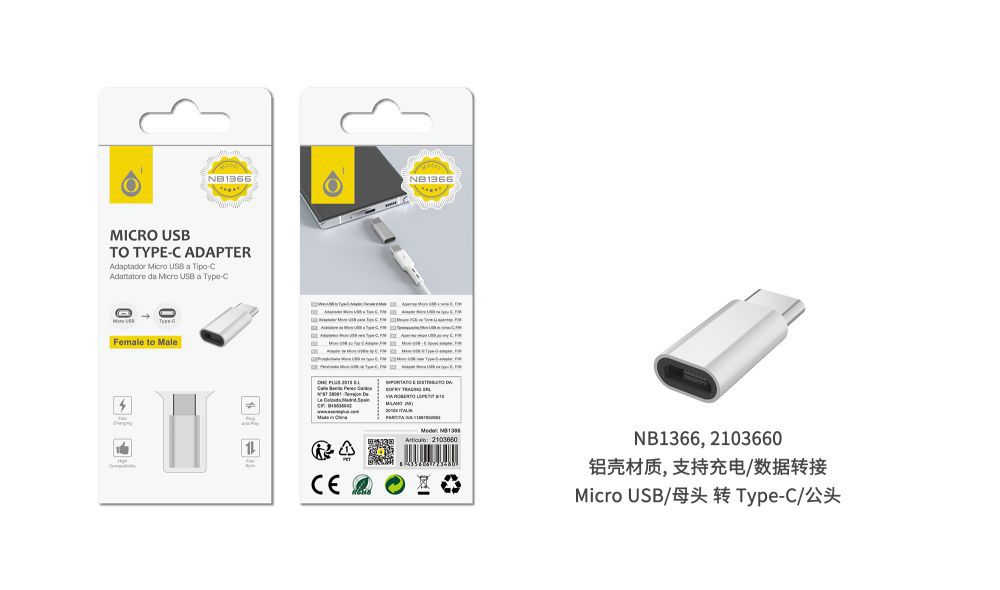 NB1366 NE Adaptador de Micro USB Hembra a Type-C Macho, Negro