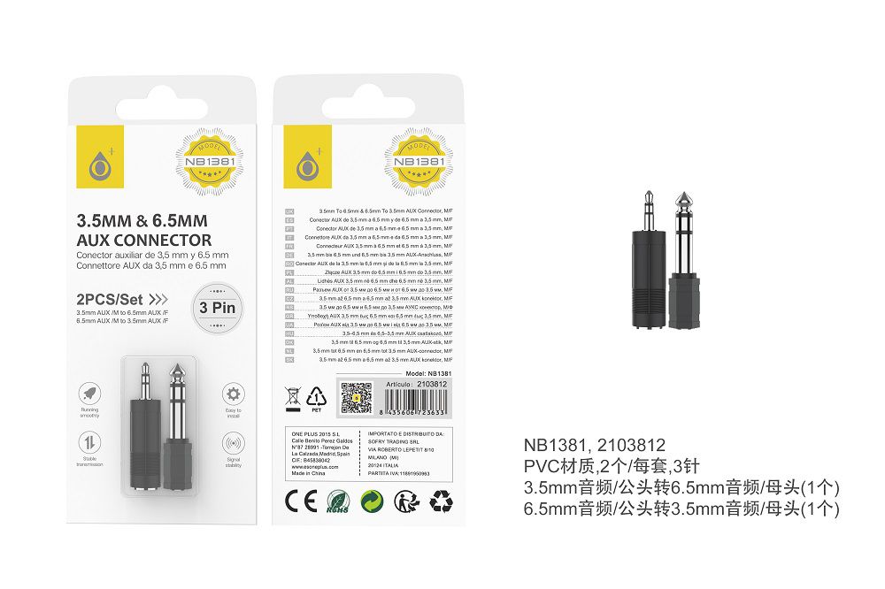 NB1381 NE Adaptador AUX  Pack de 2 ,(AUX 3.5 Macho  a 6.5 Hembra),(AUX 6.5 Macho a 3.5 Hembra) , Negro