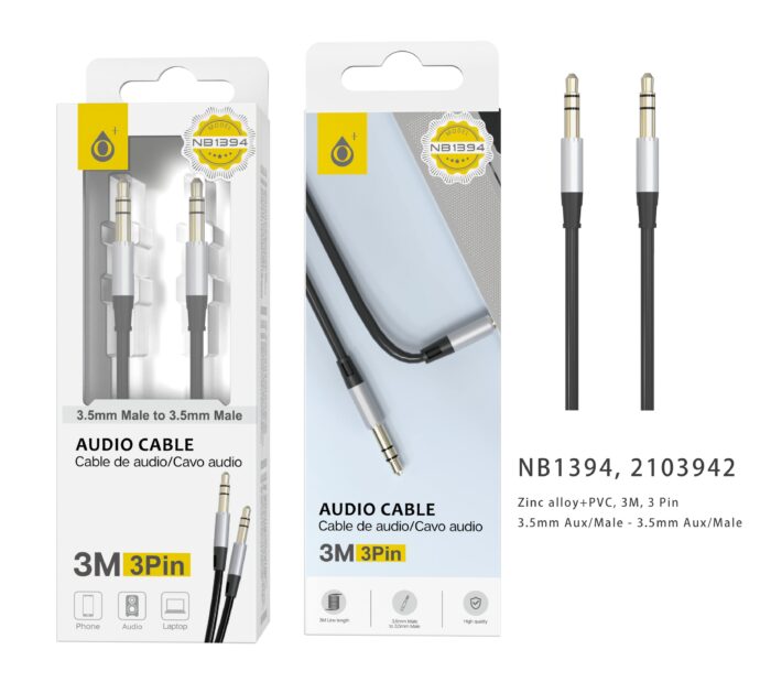 NB1394 NE+PT Cable de Zinc audio 3.5mm Macho a Macho, Cable 3m, Negro+Plata