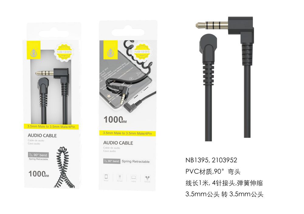NB1395 NE Cable de Audio en espiral 4Pin (Macho a Macho), Clavija de Jack 3.5mm en 90°, Cable 1m, Negro