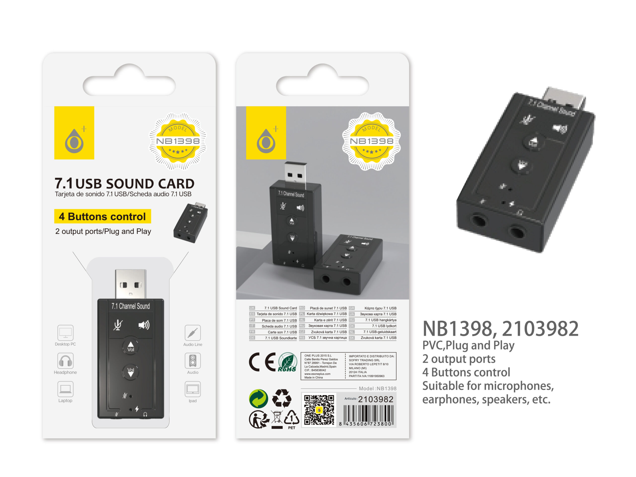 NB1398 NE Tarjeta USB de Sonido/Audio externo 7.1, con boton de control, 2 Salida de Jack ,Negro