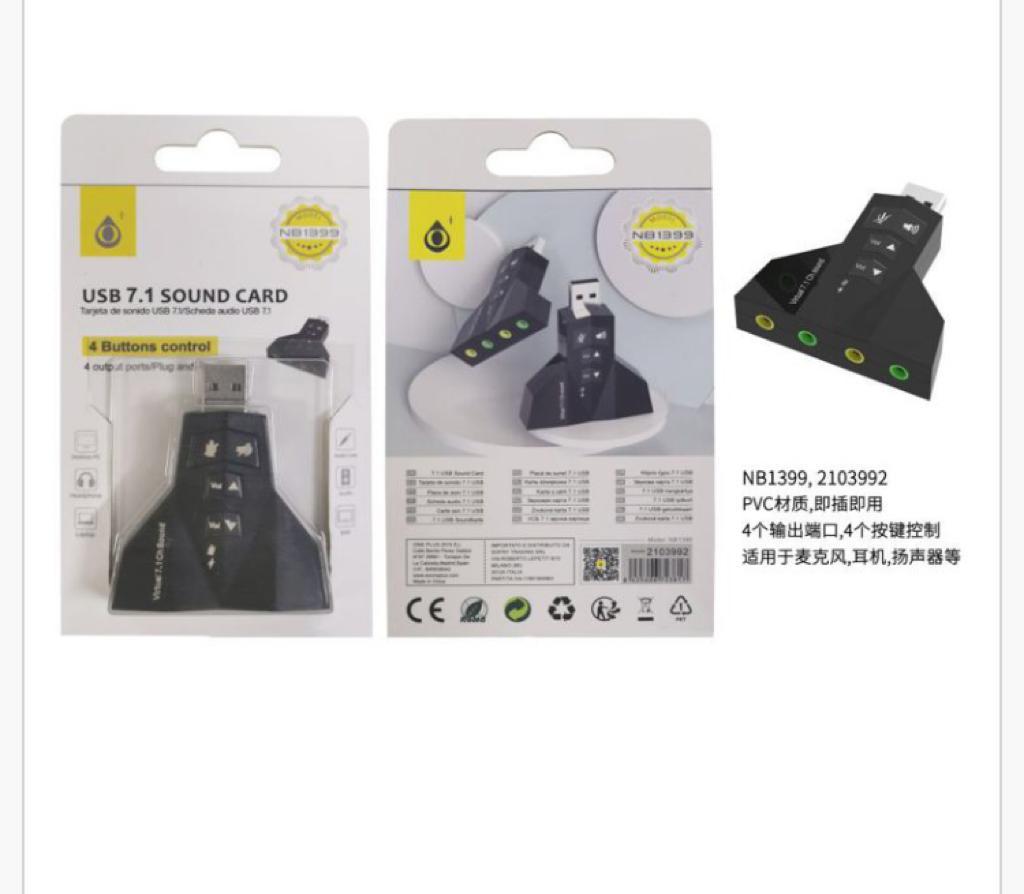 NB1399 NE Tarjeta USB de Sonido/Audio externo Dual Virtual 7.1, con boton de control, 4 Salida de J