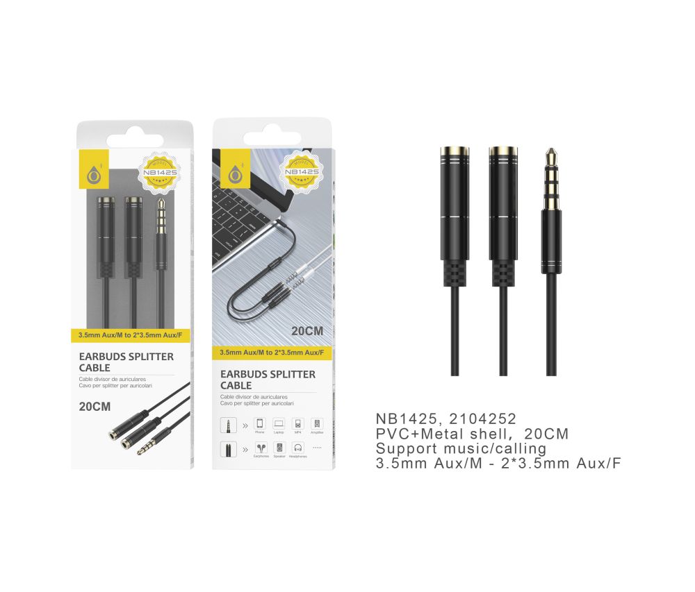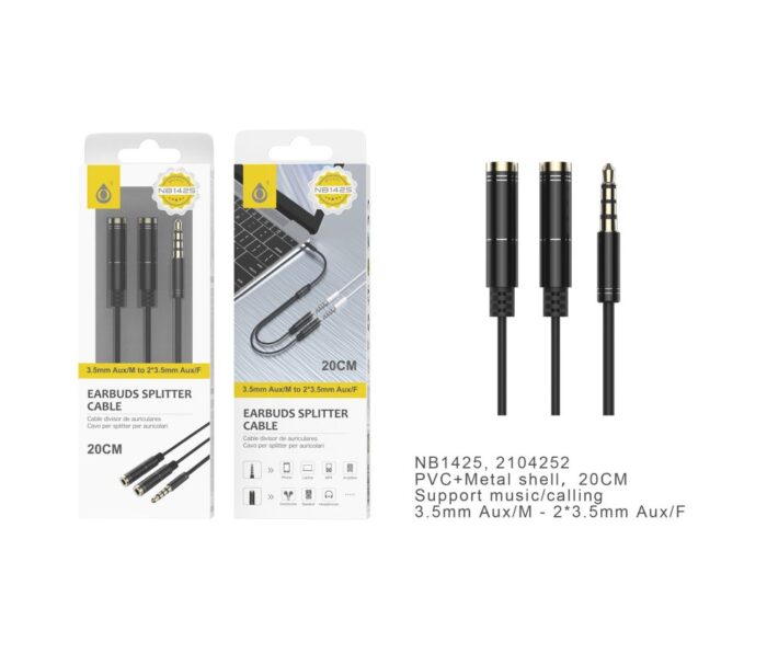 NB1425 NE Cable Divisor Splitter de Audio, Jack 3.5mm (Macho) a 2*3.5mm (Hembra), 20cm, Negro