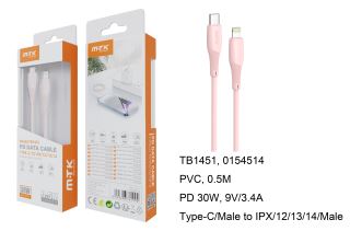 • TB1451 NE Cable de Datos Walsh PD Type C a Lightning, 30W/9V/3.4A, Cable 0.5m, Negro