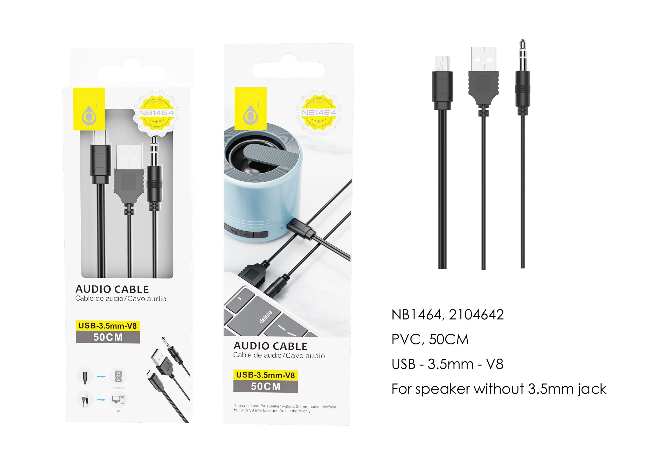 NB1464 NE Cable de Audio USB/Jack 3.5mm a V8(Micro USB), 50cm, Negro