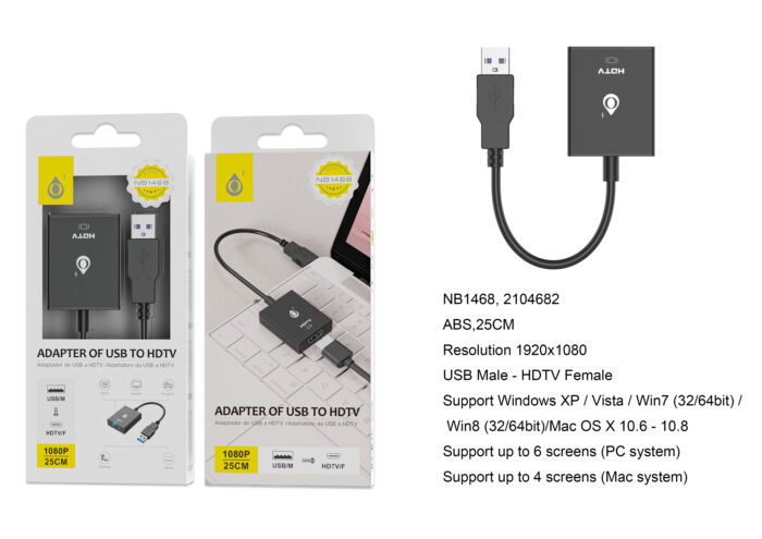 NB1468 NE Adaptador USB (Macho) A HDMI (Hembra)1080P, 25cm, Negro