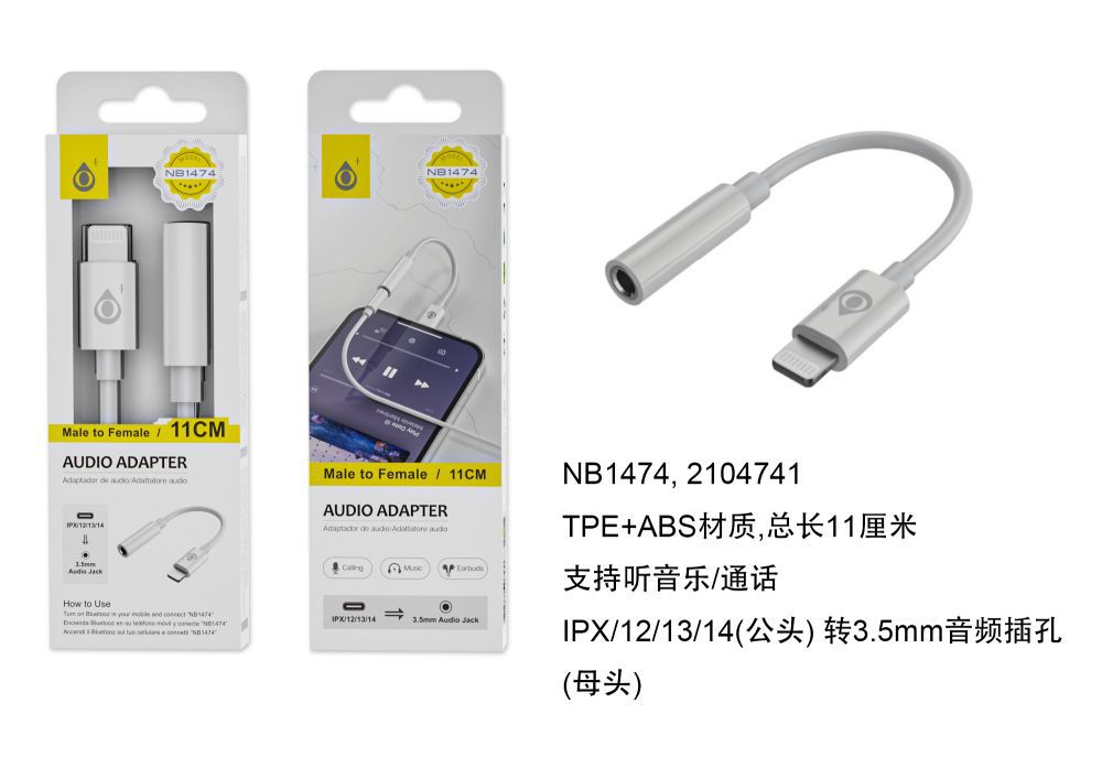 NB1474 BL Adaptador de Audio lightning (Macho) a 3.5mm (Hembra), Soporta musica y llamada, Necesario Conectar Bluetooth, Blanco