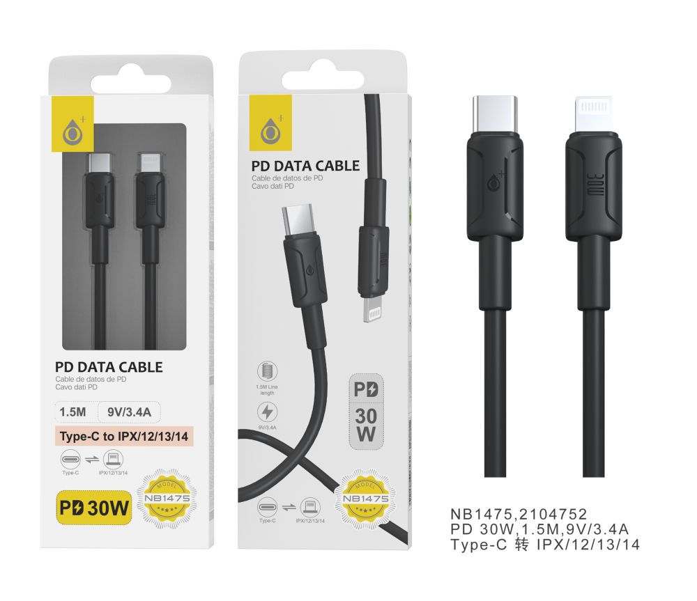 NB1475 NE Cable de datos Finn nylon trenzado para Type-C a Lightning . Carga Rapida PD.30W/9V/3.4A. 1.5M. Negro