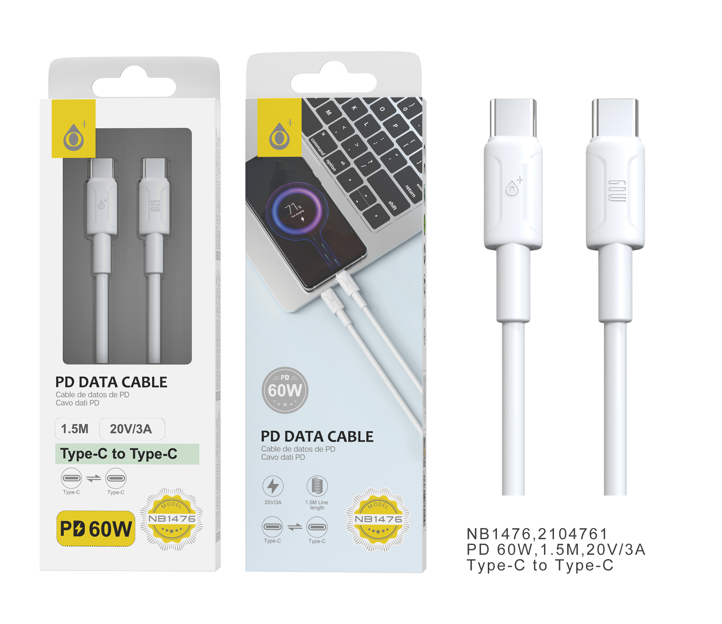 NB1476 BL Cable de datos Finn para Type-C a Type-C  , Carga Rapida PD, 60W/20V/3A, 1.5M, Blanco