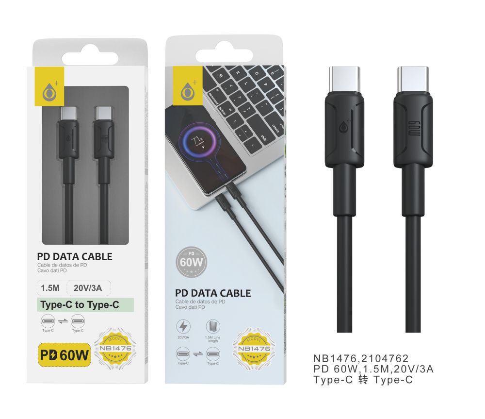 NB1476 NE Cable de datos Finn para Type-C a Type-C , Carga Rapida PD, 60W/20V/3A, 1.5M, Negro