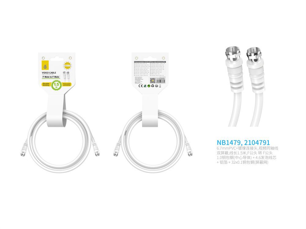 NB1479  Cable de Video(Coaxial) Conector F banado en niquel Macho a Macho, doble blindaje, 1.5 Metro, Blanco