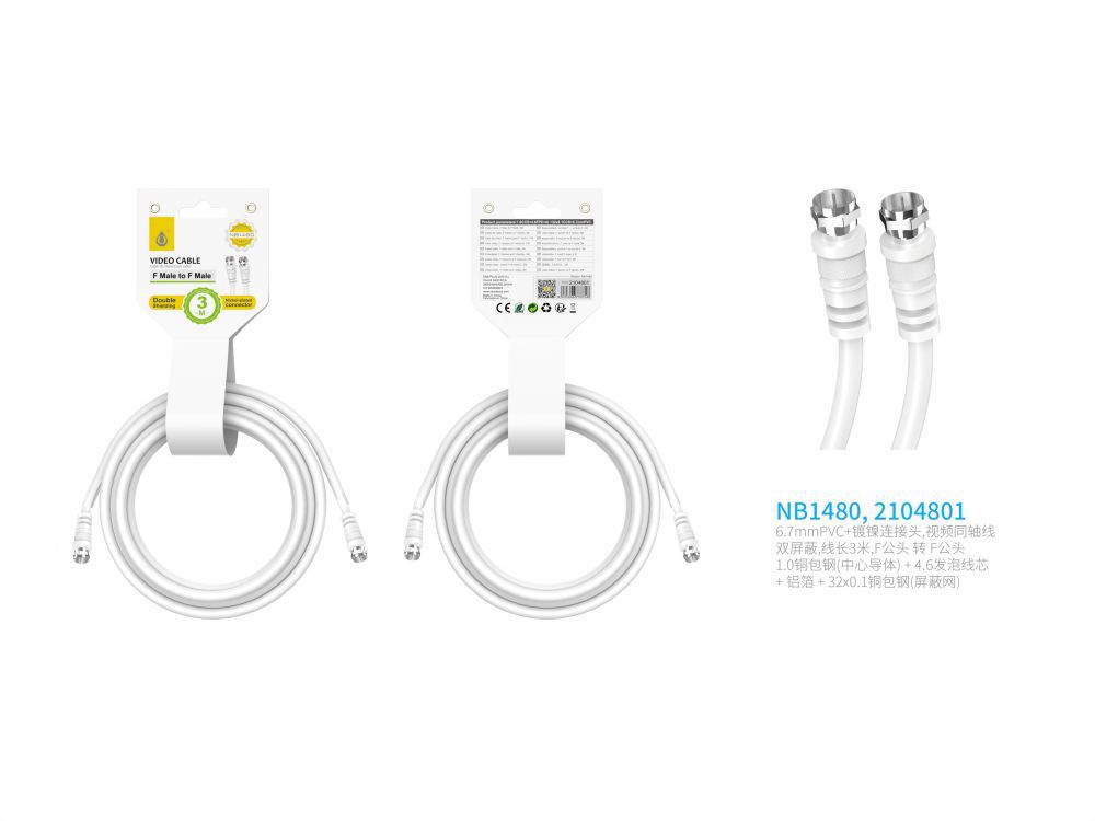 NB1480  Cable de Video(Coaxial) Conector F banado en niquel , doble blindaje, 3 Metro, Blanco