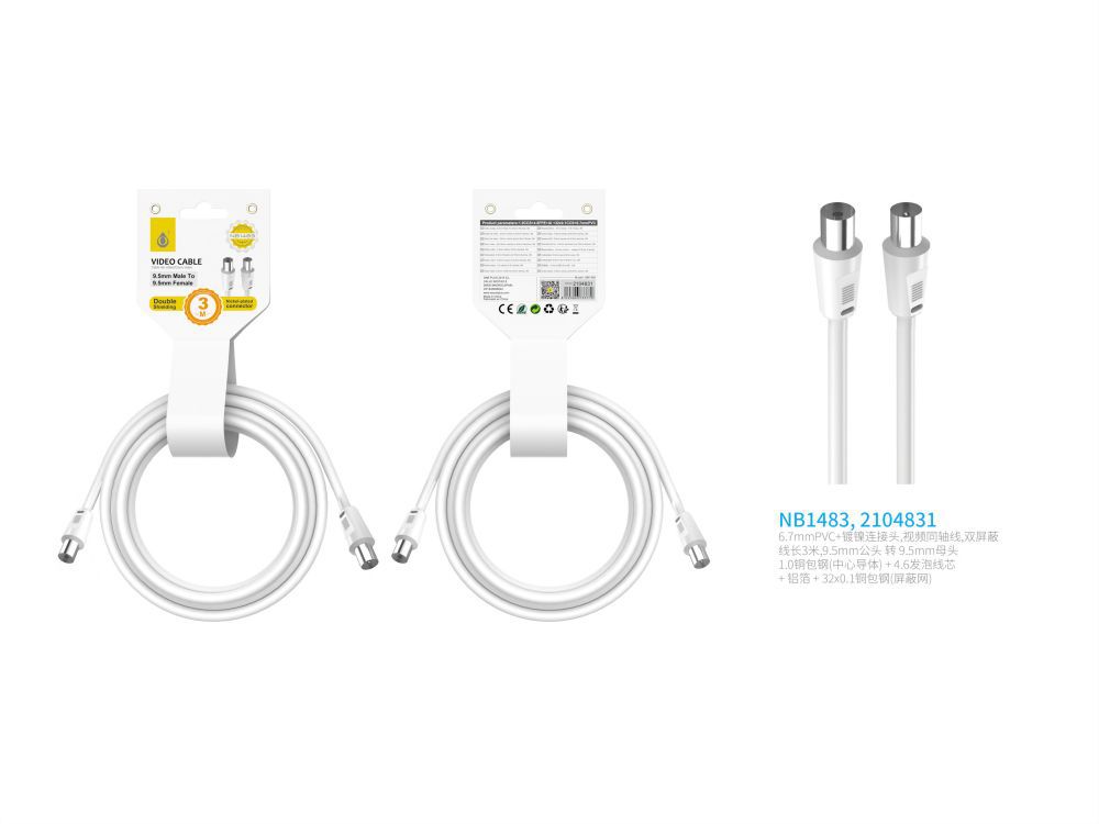 NB1483  Cable de Video(Coaxial)Conector banado en niquel 9.5mm Macho a Hembra , 3 Metro, Blanco