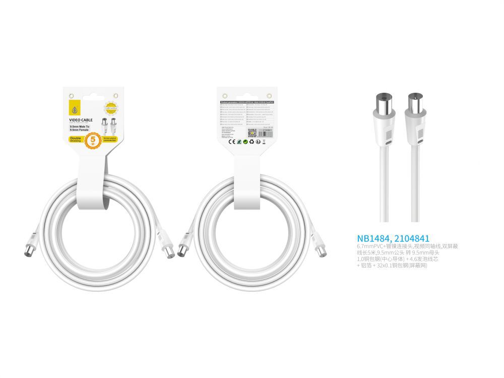 NB1484 Cable de Video(Coaxial)Conector banado en niquel 9.5mm Macho a Hembra , doble blindaje, 5 Metro, Blanco