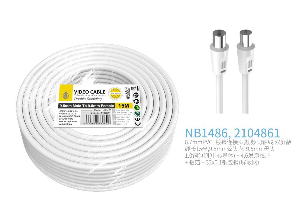 NB1486 Cable de Video(Coaxial)Conector banado en niquel 9.5mm Macho a Hembra , 15 Metro, Blanco