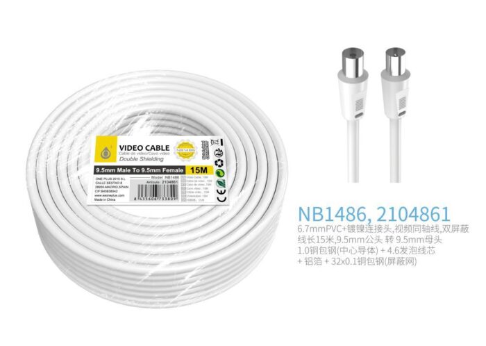 • NB1485 Cable de Video(Coaxial)Conector banado en niquel 9.5mm Macho a Hembra , doble blindaje, 10 Metro, Blanco