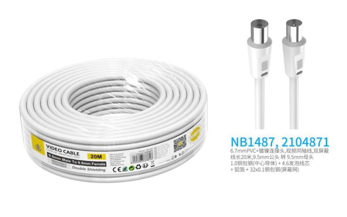 NB1487  Cable de Video(Coaxial) Conector banado en niquel 9.5mm  Macho a Hembra, doble blindaje, 20 Metro, Blanco