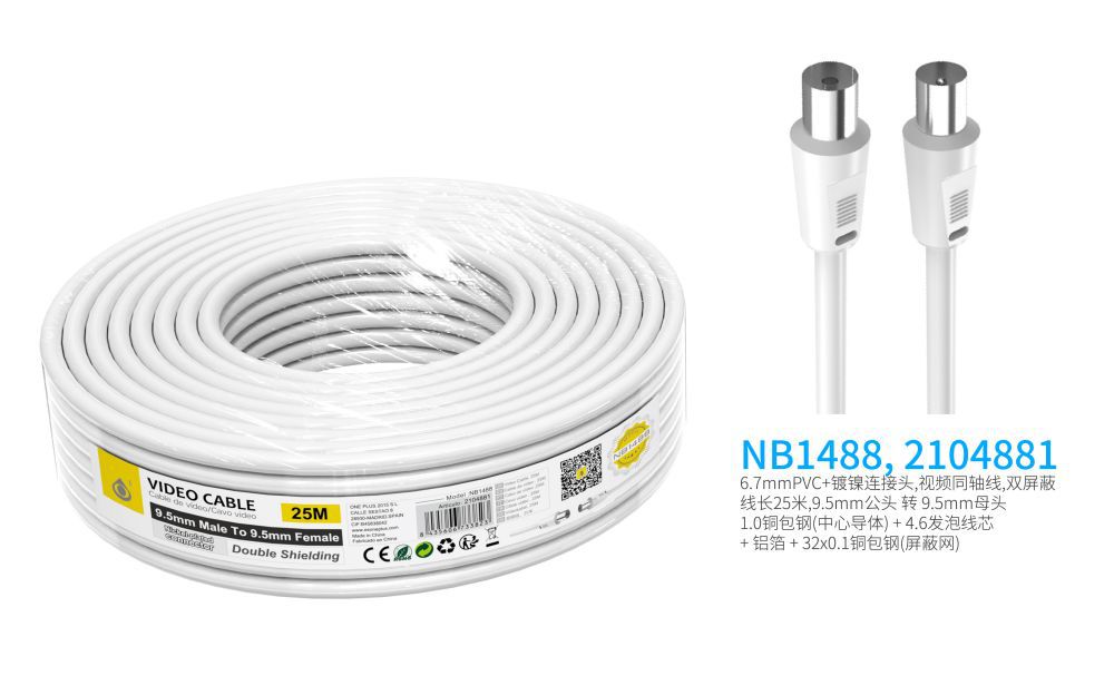 NB1488 Cable de Video(Coaxial)Conector banado en niquel 9.5mm Macho a Hembra , doble blindaje, 25 Metro, Blanco